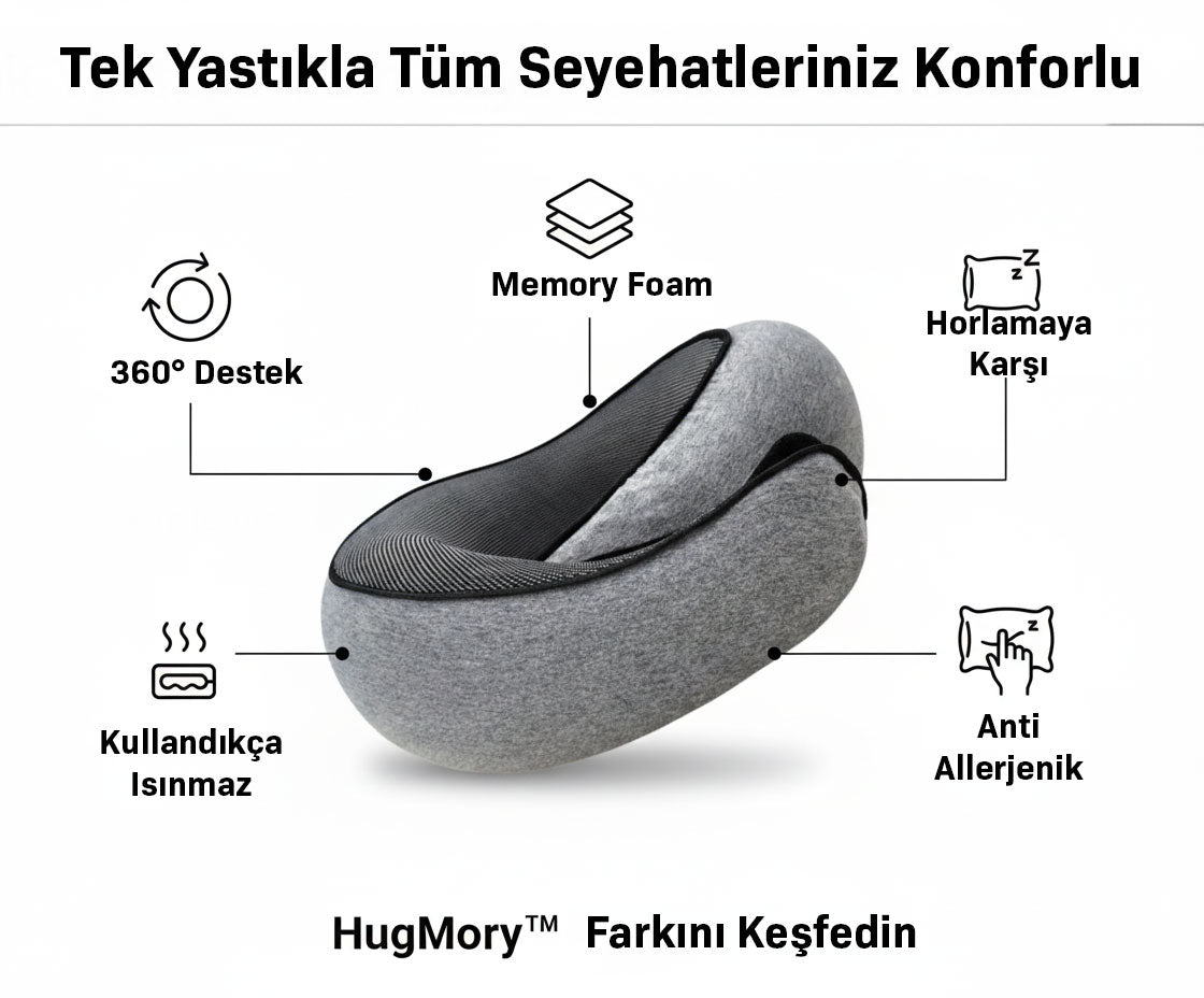 “Huzurlu ve konforlu bir yolculuk yapın, varışta dinlenmiş ve enerjik hissedin. HugMory – Her yolculuğu keyfe dönüştürür, boynunuzu rahatlatır ve size sakin bir zihin bırakır.”